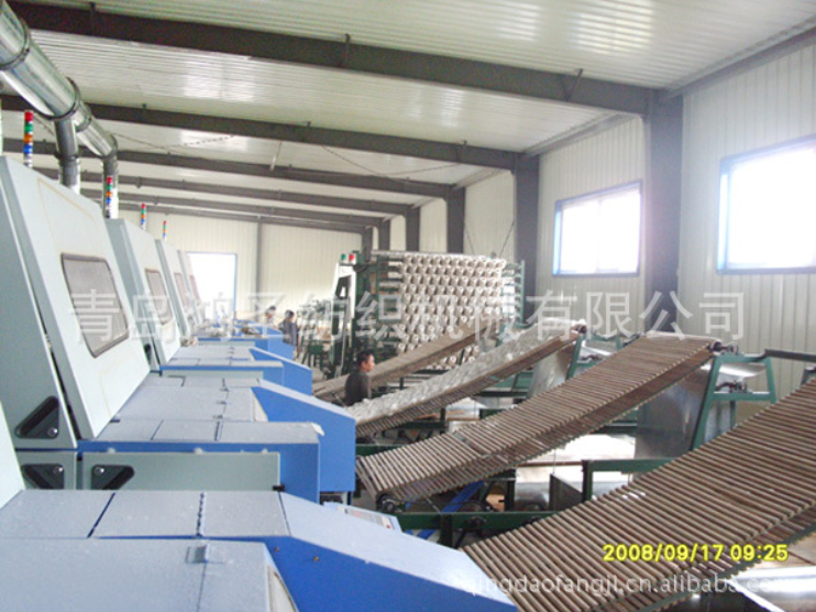 開送棉機-梳棉機(梳理機)-鋪網(wǎng)機-針刺機-拉斷機(切斷機)-自動裝套機。